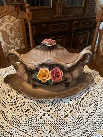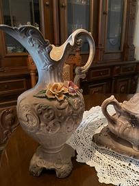 Elegante set composto da due brocche ornamentali ed una zuppiera con piatto coordinato, entrambi in ceramica lavorata a rilievo, con dettagli floreali dipinti a mano. Lo stile richiama la tradizione Capodimonte, con rose in ceramica applicata e motivi barocchi. Ideali come centrotavola o oggetti decorativi per ambienti classici o shabby chic.