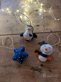 Set unico di 5 pezzi fatti a mano: pupazzo di neve, omino di pan di zenzero, pinguino, guanto e stella decorata con glitter e perline.
