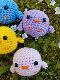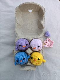 Set decorazioni per Pasqua composto da 4 pulcini realizzati ad uncinetto in 100% acrilico con imbottitura in ovatta e riso. Come rappresentato in foto verranno spediti all'interno di un simpatico porta uova in cartone di riciclo. Attenzione: i fiorellini in foto NON sono inclusi. Non valuto offerte o sconti, il prezzo è fisso.