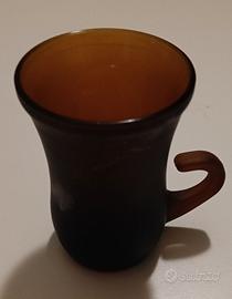 Questa è una tazza da caffè/liquore in vetro ambrato smerigliato, un pezzo vintage da collezione, caratterizzata dalla sua forma svasata e dal manico curvo. Il vetro ambrato è noto per la sua capacità di bloccare la luce e proteggere il contenuto.