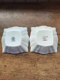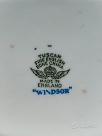 Il marchio "Tuscan" era utilizzato da R.H. & S.L. Plant Ltd., un'azienda di ceramiche inglese con sede a Stoke-on-Trent. Il marchio completo (sul fondo dei piattini) recita "Tuscan Fine English Bone China Made in England 'Windsor'". Il modello "Windsor" è un design con motivo floreale, interrotto, che risale agli anni '40. Misure: 12,5 cm larghezza e lunghezza perché sono quadrati e cm 2,5 circa profondità. Qualche anomalia negli angoli in cui un po' del colore è andato via ma dato che sono pezzi vintage è normale. Ho fotografato entrambi e ciascuno dei due che compongono il set.