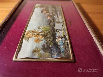 set di 2 quadri con fine cornice in metallo e stoffa, con all'interno due dipinti su cartoncino di L. Cargnel. I quadri sono in buono stato ma presentano i segni del tempo su cornice e sul cartoncino (leggermente ondulato) Dimensioni cornici cm. 30 x cm. 18 dimensioni cartoncino cm. 20 x cm. 8