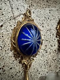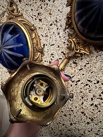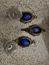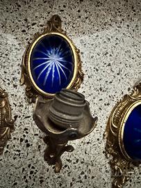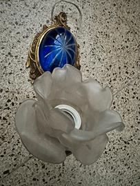 Set di 3 applique da parete in stile Liberty/Belle Époque, databili indicativamente tra anni ’40 e ’60, con struttura in ottone dorato decorato e medaglione ovale in vetro blu cobalto molato con motivo a stella. I diffusori a fiore in vetro satinato creano una luce calda e molto decorativa, tipica delle lampade d’epoca. Le applique sono funzionanti. Condizioni: •un diffusore è mancante/rotto •un altro presenta una leggera scheggiatura su un lato (poco visibile una volta installato) Nel complesso set di grande impatto estetico, ideale per arredamenti classici o vintage. Misure : 33 altezza dell’intera Applique 13,5 cm larghezza e 24 cm altezza del medaglione