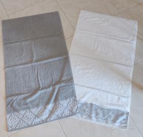 Set di tre morbidi asciugamani in spugna 100% cotone, panna, grigio perla, fucsia, rifiniti con cimossa sui bordi stretti e decoro su di un lato. Nuovi. Misure 100x58 cm