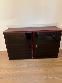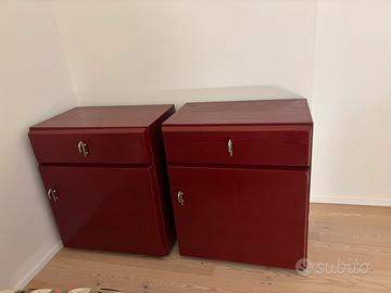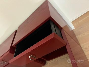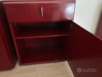 Vendo in blocco 3 mobili contenitori vintage, di cui 2 identici + 1 elemento coordinato, in legno laccato bordeaux. Misure: - i due pezzi identici misurano 70x47 x 83 altezza - il pezzo singolo misura 140x47 x 83 altezza Arredi solidi, ben conservati, con linee pulite e stile modernista, ideali per appartamenti contemporanei, studi professionali, uffici Caratteristiche: •legno laccato •vani contenitori capienti •ripiani interni •maniglie in metallo •produzione di qualità