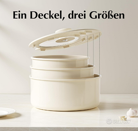 DESIGN DEL COPERTO UNIVERSALE 3 IN 1:La guarnizione in silicone liquido alimentare si adatta perfettamente a tutte le pentole da 16-20 cm. Cottura visibile senza dispersione di vapore – niente più traboccamenti durante la preparazione di riso o zuppe! Soluzione ideale per cucine piccole – risparmia il 75% di spazio rispetto ai set di pentole tradizionali!