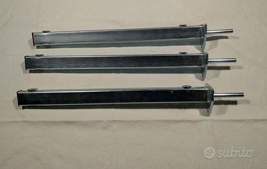 Set di tre supporti regolabili in acciaio zincato per mobili sospesi, normalmente in uso nei bagni.