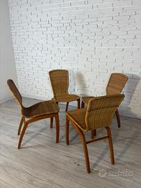 Set di 4 sedie anni ’90 in stile Libra, ispirate all’iconico design postmoderno di Christian Werner. Struttura in rovere curvato naturale con finitura color miele chiaro, schienale alto ergonomico e sinuoso, avvolgente, in midollino intrecciato naturale.
