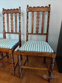 Vendo set di 4 sedie in legno massello dallo stile classico, caratterizzate da una lavorazione artigianale ricca di dettagli. Lo schienale presenta colonne tornite e un elaborato motivo intagliato a onde al centro, sormontato da un bordo superiore con decorazione scolpita a ventaglio.