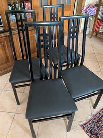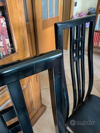 vendo set 4 sedie in legno colore nero laccate con seduta imbottita e rivestita in simil pelle nero. Schienale alto con listelli verticali, design moderno ed elegante. In buone condizioni, comode e robuste con piccoli segni di usura come da foto. Vendo preferibilmente in blocco. Ritiro sul posto zona Sasso Marconi Bologna.