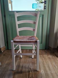 Eleganti ideali per dare un tocco rustico e accogliente a cucina, sala da pranzo o veranda. Struttura in legno massello verniciato bianco, schienale sagomato a tre l 4istelli orizzontali e seduta intrecciata in paglia naturale.