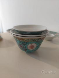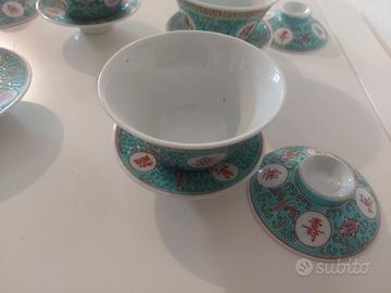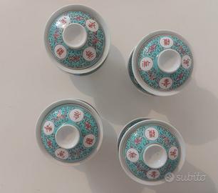 Splendido set di 4 Gaiwan, tazzine da tè cinesi tradizionali, complete di coperchio e piattino coordinato. Realizzate in porcellana smaltata con la classica lavorazione a rilievo tipica della metà del '900 (stile "Famille Rose"). Ogni pezzo è composto da 3 parti (tazza, coperchio e piattino), ideale per l'infusione del tè in foglie secondo il metodo tradizionale.