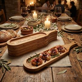 La forma allungata accoglie con grazia naturale file ordinate di bruschette croccanti, spiedini, involtini di prosciutto crudo, pomodorini confit e foglie di basilico appena colte. Ogni elemento trova il suo posto, come in un quadro di natura morta rinascimentale reinterpretato in chiave contemporanea.
