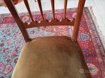 Vendo elegante set di 5 sedie in legno dal design classico e raffinato. Un arredo perfetto e comodo per completare un tavolo da pranzo in stile tradizionale o per dare un tocco vintage al salone. Caratteristiche (per singola sedia): Struttura: Realizzate in solido legno lucido (tonalità calda). Gli schienali sono finemente lavorati con colonnine tornite, mentre le gambe anteriori presentano eleganti scanalature decorative. Seduta: Ampie e confortevoli, sono morbidamente imbottite e rivestite in tessuto tipo velluto color senape/oro antico. Il perimetro delle sedute è impreziosito da classiche borchie metalliche. Le sedie sono in ottime condizioni generali. Strutturalmente sono robuste, solide e stabili. Il legno è ben tenuto e lucido. Il tessuto delle sedute è integro, senza strappi o macchie evidenti, presentando solo i lievi e normali segni del tempo tipici dei mobili vintage. Vendo preferibilmente il set completo da 5. Solo ritiro a mano a Torino (zona Santa Rita). Visto l'ingombro, non effettuo spedizioni. Disponibile per altre foto o per visionarle di persona. Prezzo trattabile.