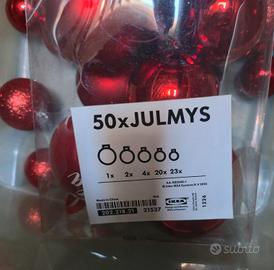 Set completo composto da 50 palline decorative IKEA JULMYS in plastica resistente, leggere e perfette per addobbare l’albero o altri elementi decorativi natalizi.