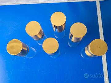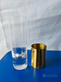 Come da titolo vendo Set 6 Bicchieri Vintage in Cristallo e Ottone, stile Gabriella Crespi. Realizzati in cristallo trasparente e base rimovibile in ottone con finitura lucida. Design cilindrico alto. Buone condizioni generali, la parte in ottone mostra alcuni segni di usura. Perfetti per collezionisti o arredamenti. Misure: altezza bicchiere circa 18cm, altezza base in ottone circa 8cm, diametro bicchieri circa 6cm.