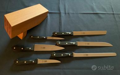 Set composto da 6 coltelli da cucina + ceppo in legno chiaro.