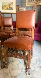 Set di 6 Sedie Antiche in Pelle e Legno Intagliato