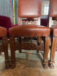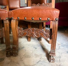Splendido set di 6 sedie d'epoca in stile Neo-Rinascimentale, risalenti alla fine del XIX secolo / inizio XX secolo. Un esempio di alta ebanisteria, perfetto per chi cerca pezzi autentici per arredare una sala da pranzo prestigiosa, uno studio o un salone di rappresentanza. Caratteristiche Principali: • Materiali: Struttura in legno massello (probabilmente noce o faggio tinto) finemente intagliato a mano. • Seduta e Schienale: Rivestiti in vera pelle color cuoio naturale, caratterizzata da una splendida patina del tempo che ne certifica l'autenticità. • Dettagli di pregio: • Gambe anteriori mosse con terminali a zampa di leone. • Traverse anteriori e dorsali riccamente intagliate con motivi a volute e foglie d'acanto. • Finiture con borchie in ottone originali lungo i profili. • Quantità: Set completo da 6 sedie (raro da trovare integro in queste condizioni).