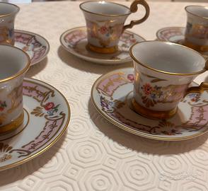 Set di sei tazzine da caffè con piattino in porcellana fine, decorato con motivi floreali policromi e ricchi dettagli in oro su fondo bianco e rosa. Le tazze presentano manici dorati elegantemente sagomati e bordature dorate. Il marchio 'Saxe' con corona dorata è visibile sotto le tazze.