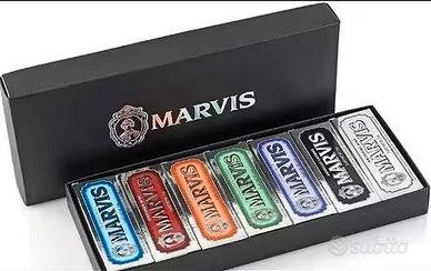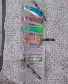 Bellissimo set di 7 dentifrici Marvis da collezione, ognuno da 25 ml. I dentifrici sono nuovi e in perfette condizioni, contenuti in un'elegante confezione regalo.