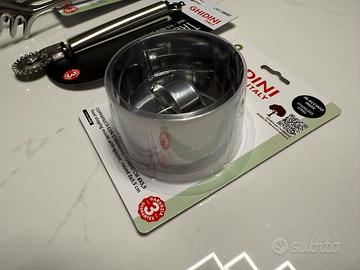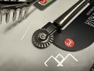 Il set marca Ghidini comprende: - un taglia pasta in acciaio inox (4x19,3x2 cm) - una molla per spaghetti in acciaio inox (6,5x20x6,2 cm) - un coppapasta tondo con stantuffo (8x5,5 cm)