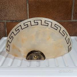 4 Applique da parete con un design semicircolare e un motivo decorativo. - Finitura in vetro traslucido con sfumature beige. - Dettagli decorativi a greca. - Struttura di supporto in metallo. Misure: - Lunghezza 30. - Profondità 16. - Altezza 10.