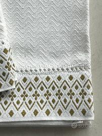Vendo doppia coppia di asciugamani ricamati a disegno geometrico e rifiniti a mano. Tessuto di puro cotone colore bianco. Il set è compost da 1 asciugamano viso 100x55 centimetri e 1 asciugamani ospiti - bidet 55x40 centimetri. Nuovi, mai usati, vendo per inutilizzo.