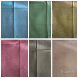set da 6 asciugamani vintage anni 60 Bassetti in fiandra di lino damascata colorati uno azzurro uno verde uno giallo uno rosa scuro uno rosa pallido uno grigio perla misurano 62x110 cm nuovi. consegna a mano Ravenna Cesena Forlì oppure spedizione a carico dell acquirente