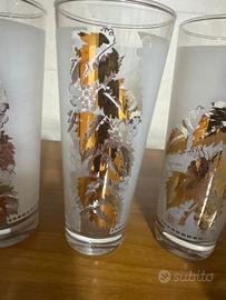 Vendo un set di bicchieri vintage, probabilmente degli anni '50, decorati con motivi dorati simili a quelli prodotti da marchi come Culver o Dominion.