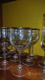 il set di bicchieri è un servizio in vetro trasparente con bordo dorato. Al centro spiccano una caraffa con tappo sferico e una bottiglia coordinata.