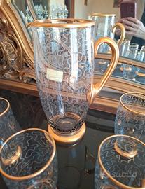 set di brocca e bicchieri vintage caratterizzato da un motivo decorativo a linee sottili e finiture color oro, tipico di produzioni artistiche passate.