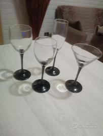 Vendo set di bicchieri a calice con base nera formato da : 10 bicchieri da acqua 11 da vino 11 da martini e 4 flute.