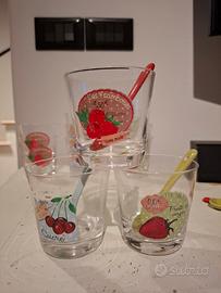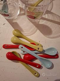 i bicchieri sono decorati con 3 diversi disegni effetto vintage e i cucchiaini hanno 3 diversi colori in abbinamento.