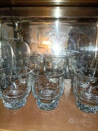 Elegante set di bicchieri in vetro trasparente con decorazioni floreali, ideale per acqua e vino. Include una bottiglia vintage.