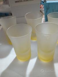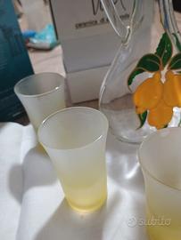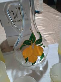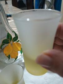 6 bellissimi bicchierini gialli e bianchi con bottiglia per il limoncello.La bottiglia è decorata a mano. Il set è di vetro ed è molto bello per le serate edtive