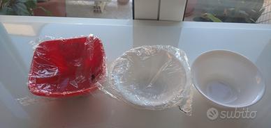 mai usate, sono 4 ciotole due ciotole bianche sono di ceramica e le due rosse sono di plastica