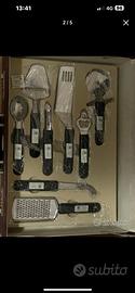 Valigetta contenente set coltelli. Contenuto: 6 coltelli da tavola 6 forchette da tavola 7 coltelli vari utilizzi 1 forchettone per arrosti 8 accassori ( cavatappi, sbuccia patate, ecc)
