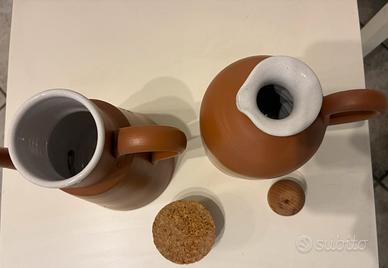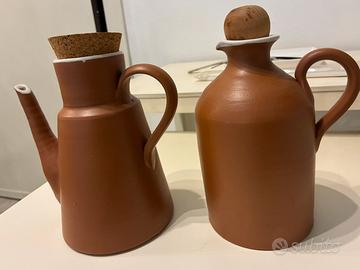 Set di contenitori in cotto originali e mai utilizzati per olio e aceto. Classico colore del cotto di Mamma Ro’ linea cotto. Dimensioni simili . Con tappo in legno e sughero. Usati solo per arredo.