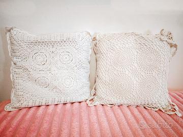 Vendo 4 Cuscini sfoderabili con cerniera posteriore, ognuno con un differente disegno ricamato, imbottiti, dimensioni 40 cm x 40 cm. Esterno ricamato all'uncinetto, in cotone bianco. Lavabili. Si possono comprare tutti assieme o anche a coppie di due. PREZZO PER OGNI SINGOLO CUSCINO EURO 15,00 Prezzo alla Coppia EURO 30,00 Prezzo di tutti e 4 i cuscini EURO 60,00