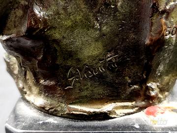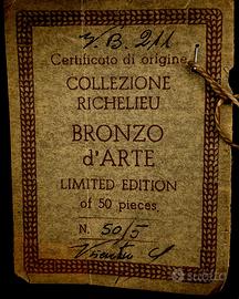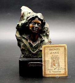Set di due busti in bronzo su un cubetto in marmo nero dello scultore Gianni Visentin (1938-2010), con certificato di autenticità che garantisce che queste opere sono state realizzate con la tecnica a cera persa. Questi pezzi sono numerati e firmati, incisi dall’Autore. Edizione limitata: 50 esemplari. Collezione Richelieu, del famoso scultore e pittore Gianni Visentin che ha esposto in vari musei del mondo. Gianni VISENTIN (1938 - 2010) nasce in Veneto nel 1938. Si forma inizialmente come pittore prima di dedicarsi alla scultura. Tra la metà degli anni ’60 e la fine degli anni ’70, l’artista vive in Francia, dove frequenta circoli artistici della post avant-garde. Nel tentativo di emulare lo stile di vita parigino, fiorisce l’amore di Visentin per la scultura, mentre la pittura perde importanza. Visentin resterà fedele al mezzo della scultura, utilizzandolo per esplorare una pletora di temi fondamentali quali l’ambiente e la riconciliazione di amore, bene e male, lo spirito moderno irrequieto e il pensiero metafisico. Convoglia questo fervore per esprimere la sua rabbia per il degrado dell’ambiente, così come la pace dell’umanità e la ricerca della solidarietà, della libertà e della riconciliazione. Grazie a questi temi, Visentin indaga nell’intimo e nel profondo dell’anima umana. Misura: altezza 17 x 10,9 x 8,9 cm.