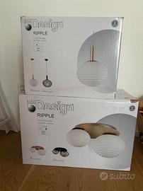 Set di Due Eleganti Lampadari.Un lampadario a semi-plafoniera ed un secondo a sospensione singola.La base é metallica di colore dorato antico. Lo stile è classico moderno.Sono stati usati molto poco (meno di 2 anni in una casa di vacanza), praticamente come nuovi.Verranno spediti imballati nella confezione originale!Verranno incluse le lampadine gratuitamente.prezzo novo:270euro (Leroy Merlin)