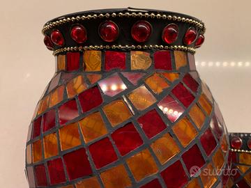 Set di due vasi in vetro decorato con mosaico nei toni caldi del rosso e arancione, con dettagli in rilievo e perline decorative sul bordo superiore.