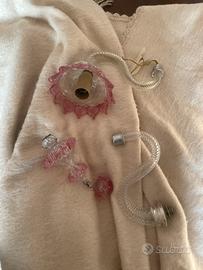 Vendo splendido set di lampadari di murano originali, produzione artigianale fine anni 70 che comprende grande lampadario da sala a 6 luci, lampadario da sala da pranzo a 3 luci, 3 applique, lampada da tavolo (con il rosa leggermente più tenue) e due lampade singole da soffitto, sono inclusi alcuni pezzi di ricambio. Disponibile a parte (guardare annuncio separato qui su subito) altro lampadario con disegno leggermente diverso, ma colori identici, ideale per studio. Devono essere smontati dalla parte acquirente e il pagamento deve essere in contanti al ritiro. Assolutamente no a perditempo e cacciattori di numeri di telefono. Il set è disponibile per il ritiro a Treviso zona santa maria del rovere. NON SPEDISCO.