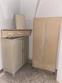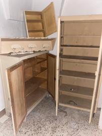Vendo in blocco set di mobili antichi, in legno massello, un armadietto a ripiani, un armadietto a ripiani con cassetto, un armadietto piccolo porta oggetti e due appendi robe