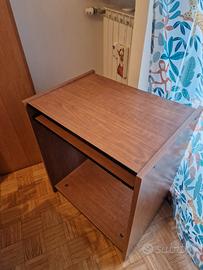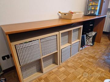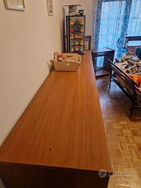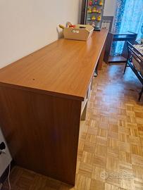 Set di mobili camera composto da tavolo e consolle/scrivania a rotelle. Si tratta di un tavolone lungo 263cm alto 90cm e profondo 59. . Una consolle/scrivania a rotelle con ripiano estraibile lunga 64cm e alta 65.5 - profondità 44. In buone condizioni senza rotture