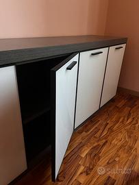 - Mobile sala di lunghezza 180cm, profondità 41cm e altezza 75cm; mensola di lunghezza 180cm, profondità 18cm e spessore 5cm. Prezzo mobile + mensola € 200.