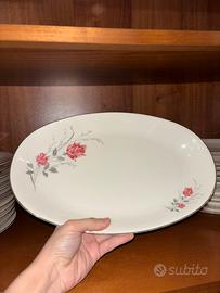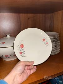 12 piatti fondi, 12 piatti piani, 12 piattini da dolce, una zuppiera con coperchio e due piatti da portata.