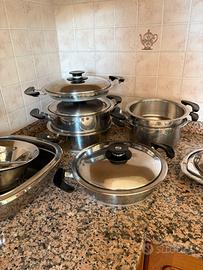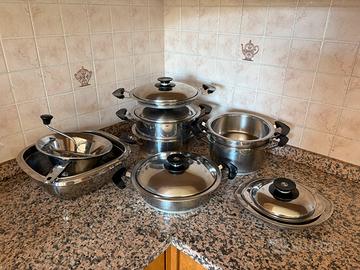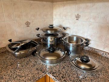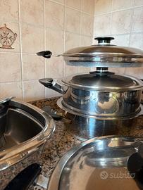 Set di pentole di varie misure con coperchi e relatuvi vassoi. In aggiunta Uno schiaccia patate mandolina.