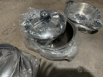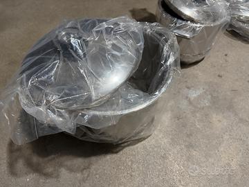 Come da foto vendesi set di pentole da cucina di ampie dimensioni in acciaio inox. Le pentole sono nuove.Consegna solo a mano e in zona Lecco.